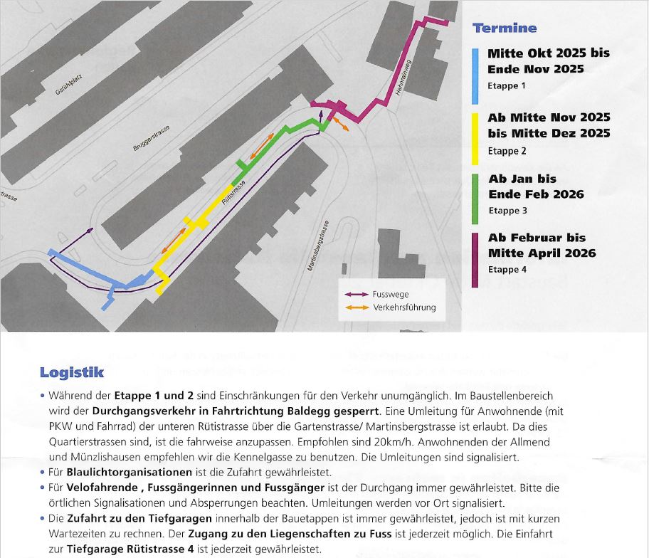 Da die Abzweigung Rütistrasse an der grossen Kreuzung gesperrt ist, wird der Verkehr über die Baldegg umgeleitet.